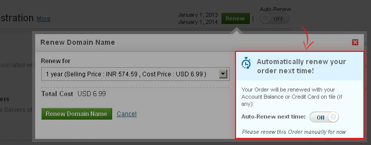 A Customer / Sub-Reseller can also turn Auto-Renewal ON for a particular Order while manually renewing it. If the Customer/Reseller turns Auto-Renewal ON, then the system will attempt to Auto-Renew that Order next renewal cycle onwards. Hence, the Customer/Reseller must complete the current process of manual renewal.