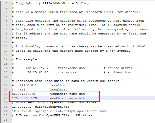 3. Add your host entires as shown in the snapshot below and save the file.
