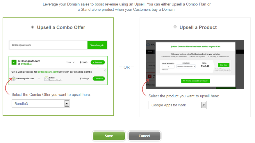 You may choose to upsell either a Combo Plan or any other product. Click on Upsell a Combo Plan or Upsell a Product as required.