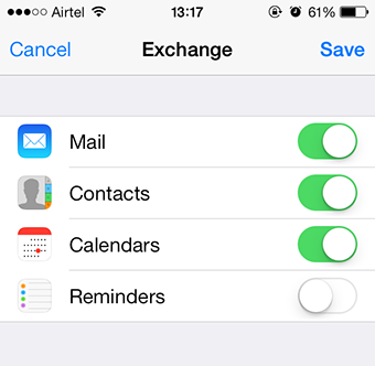7. Choose the data to be synchronized - Mail, Contacts, Calendars and/or Reminders. Only the selected options will be synchronized with the Server.