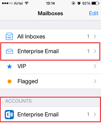 8. You can now access your Enterprise Email Account from the Mail option on your iPhone.