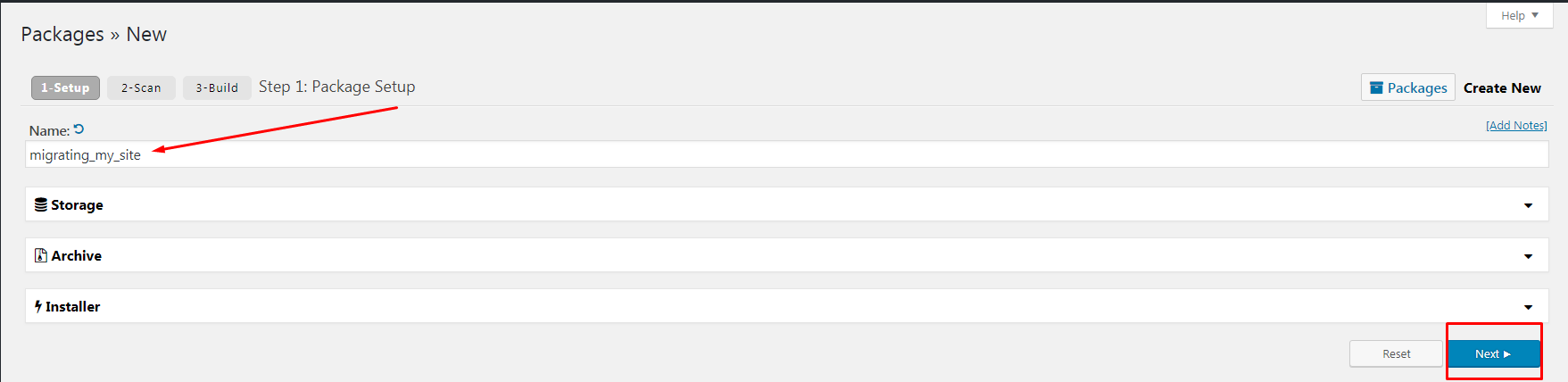 Enter the name of the package and click on Next and the Duplicator plugin will scan your WordPress site and will show you any: