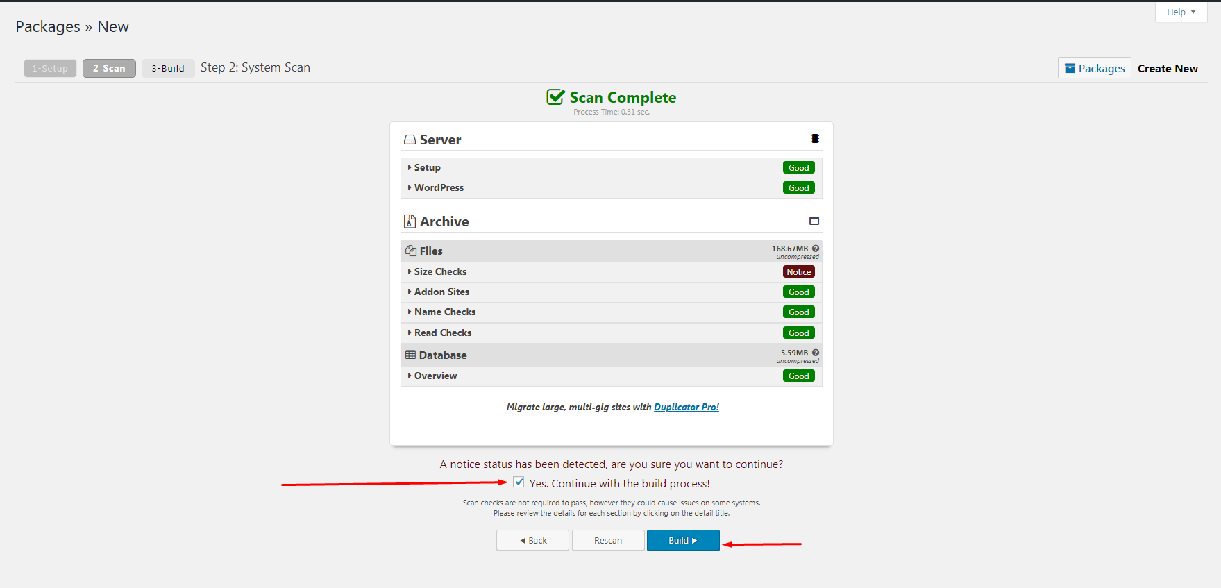 If you see an error, fix it and click on ReScan to let Duplicator plugin scan your site again. Please note that the Size Check notice will be triggered at 150MB and can be ignored on most hosts.