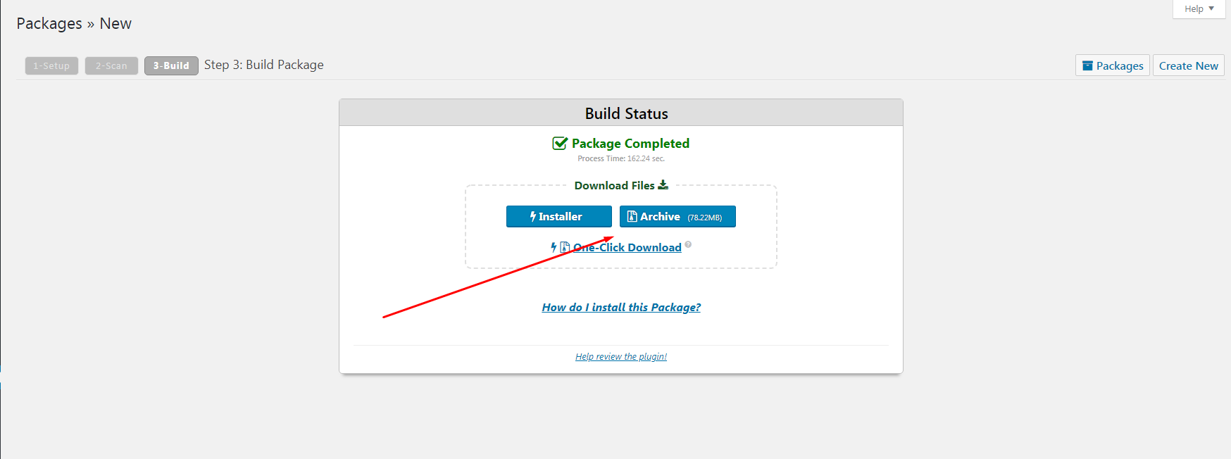 Once the unwanted files are removed from your account, please click on Build and the Duplicator plugin will create a package which contains an installer file and an archive file. Depending on the size of your WordPress site, it may take few seconds to minutes to complete.