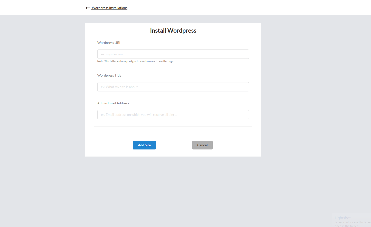 On the Install Wordpress page, enter the details and click on the Add Site button.