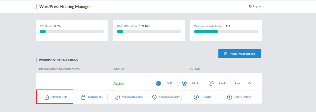 Once the WordPress installation is complete, go to WordPress Hosting Manager > More > Manage FTP and create a new FTP Account for your package.