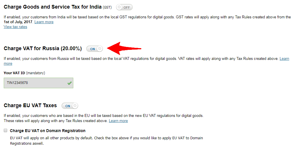 • Click on the ON / OFF toggle next to Charge VAT for Russia to disable VAT for Russia.