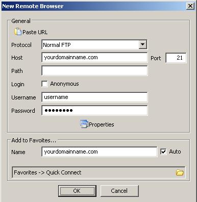 Type in your domain name as Host. Also type in the FTP Username and Password. Make sure the Port is set to 21. Click OK to connect to the server.